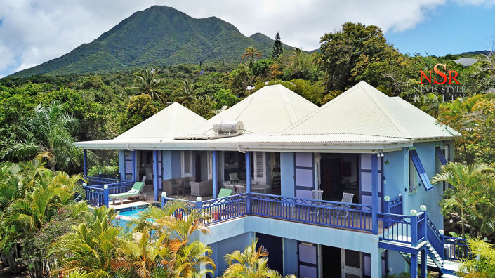 The artistic flair of the owners is evident throughout this traditionally crafted villa. From carefully picked bright colors, to amusing and tasteful decorative details that relate to Nevis’ wildlife, and the attention to comfort and elegance, Whimsea is truly enchanting.At 800 feet above sea level you will enjoy the cool trade wind that blows all year round and the stunning 180-degree view of the Atlantic Ocean with neighboring Caribbean islands framed in the background. The quaint country lane leading to the villa is lined with charming West Indian homes and ends shortly above Whimsea guaranteeing quietness and privacy. Access to all the island attractions and necessities is no further than a 20 minute drive.The casual and relax island vibes carry throughout the house with a floor plan inviting relaxation and enjoyment of the surroundings. A large open plan kitchen and living/dining area extends to the covered patio through folding doors, seamlessly blending the indoor and outdoor spaces. All the bedrooms are furnished with handcrafted mahogany beds and large armoires and both master bedrooms have walk in closets. The bathrooms are individually decorated with different mosaic tiles. The master bathrooms have extra large showers and louvered doors opening to the green foliage of palms.Whimsea is a wonderful family home that awaits you to create your own lifetime memories.The villa can be a great income generating investment as it offers all that holidaymakers look for and a lot more.