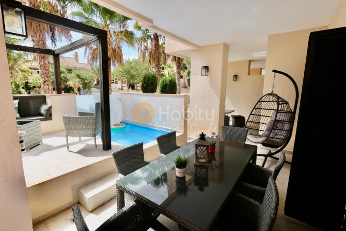 Located in El Oasis – Hacienda del Álamo Golf Resort, this south-facing corner ground-floor apartment offers all-day sunshine, spacious living, and resort-style amenities in one of Spain’s premier golf destinations. Exclusively available through us.