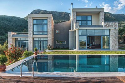 An eye catching, modern property on the road leading up to Spartilas, with incredible views across the island all the way to Corfu Town.