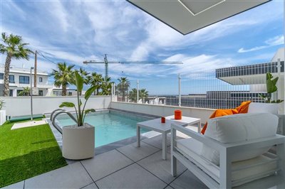 These brand-new magnificent independent villas have been built with a modern design and layout. The property boasts an open-plan living and dining area with a spacious kitchen, all of which is connected via large glass patio doors to a covered patio area, perfect for dining outdoors. There is also a guest toilet and an ensuite bedroom on the ground floor, with the additional 2 ensuite bedrooms on the first floor with a large terrace, and a rooftop solarium to enjoy the Spanish sunshine all year round.