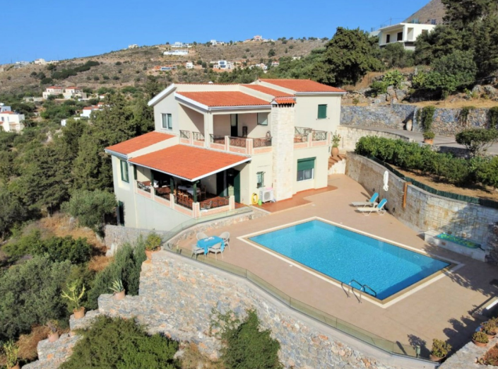 This is a spacious, luxury, elevated villa built on 2 levels which offers unobstructed sea views to the Souda Bay. The villa size is 290sqm and is sited on a plot of 1200sqm. It consists of 4 bedrooms, 2 bathrooms, one open living/dining area with a kitchen and an extra room that is currently being used as game room (billiard). The outdoor big terraces, the BBQ and the pool area supplement this gorgeous property.