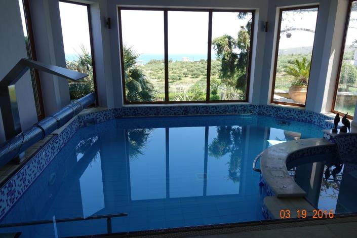 The lower floor is connected with the main entrance of the villa and the upper floor as well, with a wooden bracket imported from Canada. There is an open plan lounge /dining area, it is connected with the garage, the garden, the swimming pool and the main entrance too. ( in case someone prefers to separate the floors) . There is unobstructed sea view and it is separated from the pool area with glass separators. There are three bedrooms, kitchen, bathroom with shower, guest bathroom and a veranda. Of 36m2. Airconditioning is available in both bedrooms. Internal heated swimming pool, with hydro massage includes and a special place for thermos hydro massage and shower hydro massage with sauna potentials. The façade of the swimming pool is glass made with unbelievable sea view.