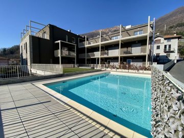 The apartment, which was built in 2015 to the highest standards and has never been lived in, forms part of a newly built elegant residence with large swimming pool, lift access, fitness area and spa with sauna and Turkish bath. The apartment provides about 70m2 of accommodation plus a covered terrace of some 20m2. Entrance is into an open plan living area with kitchen to view and French doors leading onto the covered terrace 8.2 metres by 2.4 metres with ample room for dining or relaxing with superb views over the lake. A hallway leads to the master bedroom with French doors leading onto the same covered terrace, a second bedroom and a large bathroom with shower. The apartment has been furnished with quality furniture, benefits from parquet floors in naturalised oak planks and large stoneware slabs in the bathroom. There is underfloor heating, air cooling, and electric shutters which provide the apartment with an A+ rating.