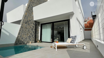Elisa Villas 3 bedroom, 2 bathroom semi-detached villas located in San Javier. Ground floor consists of an open plan living/dining room, kitchen which comes with white goods, 1 bedroom and a bathroom. 1st floor 2 bedrooms and a second bathroom, with the master bedroom leading onto a large terrace 14.25m2 from patio doors, there is also a large solarium 39.50m2. Outside you have large terraces with off road parking, private pool 10m2, LED lighting inside and outside, LED mirror in bathrooms and shower screen. Plot size 120m2 and build 94m2.