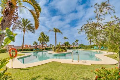 Great value three bedroom townhouse located in Estepona west, just a short walk from all amenities and only 160m from a stunning sandy beach! This fabulous property is facing south, with large terraces and spectacular views to the sea. Briefly, the townhouse is split over three levels, each linked by a private elevator; at the main entrance level you find the very spacious lounge and dining area with direct access to the private garden, the semi open fully fitted kitchen and a guest toilet. Upstairs is the master bedroom suite and two more bedrooms (one of them has the possibility of an extension) that share a family bathroom. There is also a terrace which connects with the rooftop via a spiral staircase. Underneath the property is an extremely large private garage and lots of storage space. The community is fully gated and secure, with very well maintained landscaped gardens and several swimming pools.