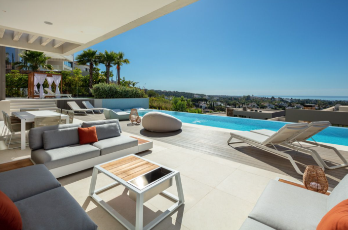 Set within a development of 5 brand new luxury villas, enjoys an elevated position within the prestigious Golf Valley of Nueva Andalucia, providing scenic mountain and sea views. Designed with a contemporary touch, has been impeccably set to face the magnificent panoramic views towards the Mediterranean Sea, all the way to the African coastline. A seamless flow between exterior and interior areas, set the stage for the quintessential easy-going Mediterranean lifestyle. Surrounded by luscious tropical gardens, the large infinity swimming pool receives all the spotlight, giving the home an oasis feeling. The design principle for this contemporary estate is being at one with nature, complementing the needs of the changing seasons while making the most of Marbella’s micro-climate. Every angle of the living/bedrooms areas have been thoughtfully designed to maximise its views, over the landscaped grounds towards La Concha and the Mediterranean sea. The villa has been distributed between 3 levels, all throughout you can find stylish design features, bright open plan rooms and a kitchen with the highest quality appliances. The first floor consists entirely of the lavish master suite, with a noble walk-in closet and complete en-suite bathroom; the remaining 3 bedroom suites are found on the ground floor.