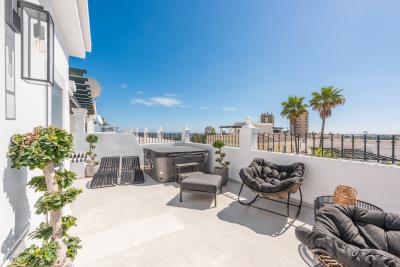 A truly stunning and very rare three bedroom duplex penthouse apartment located within Aloha Gardens, Aloha (Nueva Andalucia). This incredible property has been fully renovated and remodelled by the current owners, creating what can only be described as a one of a kind masterpiece. The property offers fabulous views to the surrounding area, including the sea, with two large and very sunny terraces - the lounge terrace complete with BBQ and exterior kitchen, and the roof top terrace finished with Jacuzzi bathtub, chill out area and even a Sauna! This is a perfect property for a family, rental investor, or someone who just wants to entertain guests from a stunning open plan home! The community is walking distance to all general amenities, including several very popular restaurants and bars, and around 15 to 20 minutes walk from both Puerto Banus Marina and Centro Plaza, and only a five minute drive to Marbella town centre. The community offers lots of onsite facilities, including 24-hour security, full property administration, letting and management service, three swimming pools, of which one is heated, flood lit tennis courts, two paddle Tennis courts, a gymnasium, sauna, Jacuzzi and beautifully maintained landscaped gardens. An absolute must view property in a truly breathtaking location!