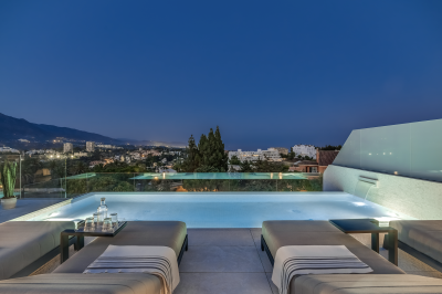 A breathtaking modern villa located within a gated private community in Nueva Andalucia. This stunning home is a very short walk from all general amenities, and a touch further to the beach and Puerto Banus Marina. The property is fully furnished to an extremely high standard, with four bedrooms, four bathrooms, an open-plan living room and a very large roof top terrace with magnificent sea and mountain views from which you can enjoy from your 8x3m private swimming pool! This exquisite property has many 5* features including, an upgraded smart home system, a cinema, Bang and Olufsen sound system, underfloor heating, and private elevator access. An absolute must view villa.