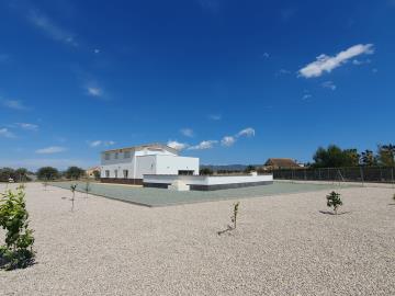 A country retreat with a modern and functional layout built with the highest quality materials; oak doors, porcelain floors, aero-thermal underfloor heating, central AC and energy saving windows throughout. A 4500m fenced plot with fruit trees and a low maintenance garden area decorated with white and grey gravel. Both areas have an automatic irrigation system.