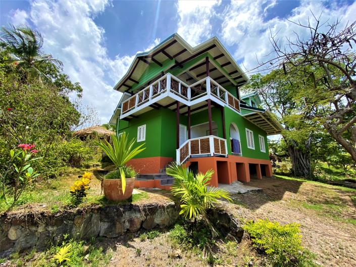 The main house is a 2-story structure that measures approximately 2,640 sq. ft. The ground floor is divided into a bedroom/ large living area, an outdoor shower, and a porch. A flight of stairs leads to the top floor or loft. This holds a large king-sized bedroom and spacious balcony. One can sit in the hammock and enjoy the beautiful Caribbean Sea View.