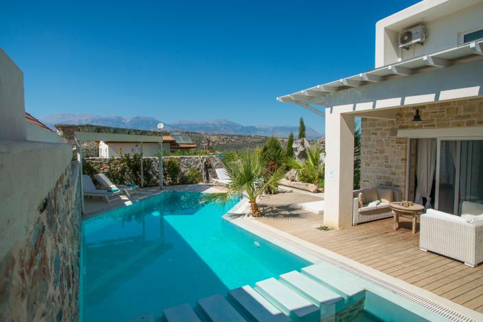 This villa was built in 2014 in a very quiet neighborhood of Pitsidia overlooking the mountains of Psiloritis. It has a living space of 205sqm while the area of the plot is 600sqm. The villa has an open plan kitchen overlooking the dining and living room and 3 spacious bedrooms with en suite bathrooms. The kitchen is fully equipped with electrical appliances and kitchen utensils. It is worth mentioning that the villa has whisper air conditioning units, internet and satellite TV installations. Outside there is a saltwater pool and Jacuzzi. The wooden floor offers various relaxation areas such as the outdoor seating area and sun loungers around the pool. The villa also has a barbecue and parking space. The property is meticulously cared for and tastefully decorated in modern tones with wooden art touches. The outdoor area is surrounded by various species of plants and trees that offer the feeling of being in an oasis. Finally, the view completes the beauty of the villa as it sees the imposing peaks of the Psiloritis mountains and the surrounding authentic Cretan landscape. Pitsidia is a well-known village in south Crete close to famous beaches such as Matala, Kalamaki and Kommos. In the village, one can find a large variety of tavernas and cafes, a bakery and pharmacy.