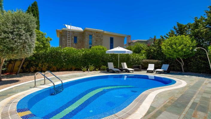 Bedroom 3, with its separate outside access, is ideal for a nanny or older children. This room also features an en-suite bathroom with a walk-in shower. The villa is fully air-conditioned and centrally heated, ensuring comfort in all seasons.