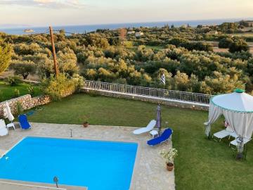 From the balconies of this beautiful villa the visitors enjoy great view of the sea, the island of Zakynthos and the islet of “Zeus”. In the surrounding area there is a swimming pool, a barbecue area and a large garden with various plants and trees. Finally, there is a large parking space, an external independent staircase that leads to the second floor and on the ground floor 2 storage rooms with a boiler room.