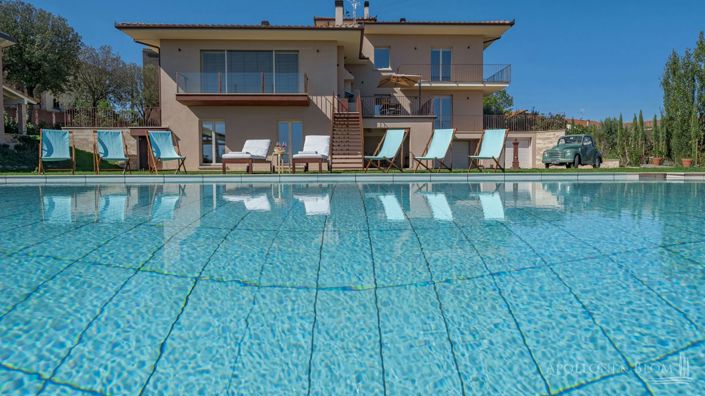 An enchanting setting amidst the Val di Chiana, this contemporary villa in energy class A4 combines timeless elegance with eco-conscious design. Situated just moments from the historic town of Foiano della Chiana, this remarkable residence offers the very finest in Tuscan living—where sustainable innovation meets refined sophistication. Completed in 2019 to the highest specifications, the property is fully equipped with state-of-the-art technology, including a 10.8 kW photovoltaic system and 8 kW solar thermal panels for electricity and hot water. Designed for maximum energy efficiency and comfort, the villa features underfloor heating powered by heat pumps and pellet burners, advanced mechanical ventilation, and a comprehensive home automation system that can be operated remotely. The villa spans approximately 820 sq m across three levels, showcasing luxurious finishes such as solid oak parquet flooring, travertine marble, and bespoke triple-glazed windows with electronically operated internal shutters. The living spaces are generously proportioned and flooded with natural light, while every room has been thoughtfully appointed for modern living. A total of four en-suite bedrooms and a study complete the living area, along with a wellness area with a Jacuzzi and Turkish bath. Outdoors, a striking infinity-edge pool sits directly in front of the villa, offering uninterrupted views over the countryside. The beautifully landscaped garden includes an automatic irrigation and lighting system, while the estate’s 3 hectares of productive olive groves (with over 3,000 trees) yield an impressive annual harvest of extra virgin olive oil. A charming guest house provides a fully self-contained one-bedroom apartment. Also included a 75 sq m basement garage, ample storage for bicycles and motorbikes, and three separate gated entrances. The villa enjoys exceptional panoramic views extending over 80 kilometres. While set in a peaceful and private location, it lies just 900 metres from essential services and within easy reach of major cultural destinations across Tuscany and Umbria. Discreet luxury, modern sustainability, and breathtaking scenery—this is a rare opportunity to own a truly unique Tuscan retreat. Furniture not included, option available on request. Property Ref.: ARZ2098Energy Efficiency Class: A4Location: Foiano della Chiana, Province: Arezzo, Region: ToscanaType: 820 sq m/9000 sq ft three-story luxury villa with garage, guest house, swimming pool, and gardenYear of construction: 2019Condition: excellentLand/Garden: 4000 sq m/1 acre garden equipped with irrigation, lighting system with crepuscular sensors, 3 automatic gates; 3 hectares/7 acres of olive grove with 330 ancient trees and 2700 newly planted; annual production of 2500 litres of extra virgin olive oil. The olive groves have a drip irrigation systemSwimming pool: 12x6m infinity edge pool and non-slip coating with solarium, hot water option available, fully fenced with iron and flowersLayout: