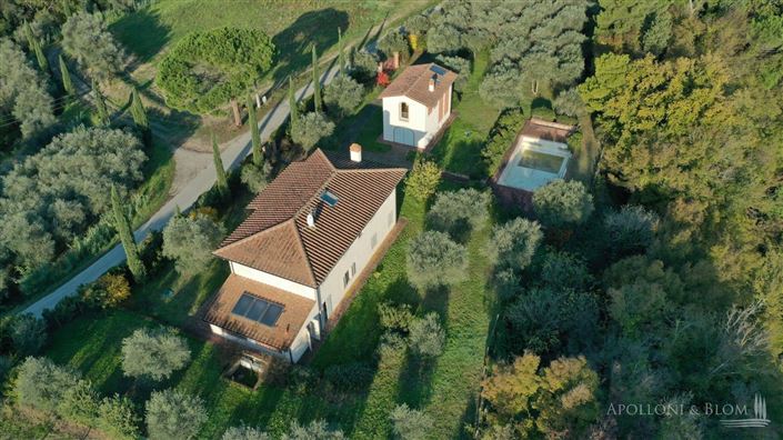 Ancient farmhouse converted in a 7-bedroom villa with swimming pool, solar panels, guest house and garden for sale in Palaia, Pisa. Within a prestigious estate that boasts a thousand years of history in the organic cultivation of vineyards with the first production of wine dating back to 1083, and where, over the centuries, rural hamlets and farmhouses were built to establish the farmers' community. After a long period of neglect, a meticulous renovation has kept the original features intact and giving an elegant style to 6 country dwellings with excellent finishes and new generation systems, air conditioning, solar panels and underfloor heating. Villa Bianca is one of three ready-to-move villas available, positioned on top of a hill in a reserved and panoramic area only 1.5 km from all services. The two-story building features light plastered facades that highlight the color of the characteristic roofs with terracotta tile and bricks, arched openings and external stairs with loggia. The interiors feature an open-plan living area defined by handmade terracotta floors and exposed wooden beams ceilings. The entrance hall harmoniously divides the dining and kitchen area from the sitting room and the staircase to the first floor. Magnificent is the brick arch in the main living room along with a fireplace and direct access to a spacious outdoor veranda designed for al fresco dining. A separate bedroom, a bathroom and a handy laundry room. A stone staircase and wrought-iron railing leads to the upper floor and the outdoor loggia with staircase. The floor is entirely reserved for four bedrooms with en-suite, featuring jacuzzi and parquet floors. Next to the villa, the old barn retains the typical "salto di gatto" brick openings in the facades and has been converted into a two-level annex with two bedrooms. The pool, with Roman-style staircase, terracotta paved sundeck and large technical room, is perfectly set in the garden and surrounded by lawn, olive trees, cypresses and Mediterranean shrubs. Just a stroll from all services and ancient wineries with direct sales and wine tastings, thirty minutes drive from the Tyrrhenian Sea sandy beaches and rocky coasts, just a stroll away from Tuscan stunning historical art cities. Villa Bianca is a ready-to-move-in charming residence, perfect as a private home to live with family and friends or to host tourists for their vacations.5 separate further country houses with similar characteristics are also available, consisting of 2 fully renovated ready-to-move-in villas with swimming pool, 3 country houses partly restored in need of internal decorations and finishes click here