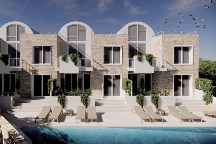 The main characteristic of the composition of the Development is the contrast between the solid ground floor made of stone and the lighter white volumes on the first floor. A big part of the design is also the privacy of each house. That is accomplished through an elaborate use of subtraction in both volumes, which creates private semi-outdoor spaces and big projective balconies.