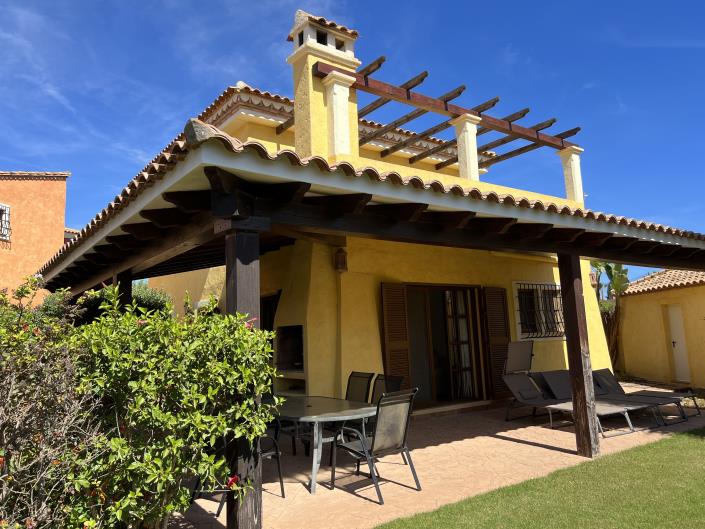 Situated in the lovely community of La Estrella is this detached pueblo villa. The property has been well maintained with the kitchen having been extended into the former downstairs cloakroom, the original pergola has an also been replaced with a tiled roof structure which could also have the addition of glass curtains/bi fold doors to create a further living space overlooking the gardens if needed. The accommodation offers open planned living room/dining room and good kitchen, 2 bedrooms and bathroom on the ground floor, while on the first floor there are a further 2 bedrooms both with en suites, the master having a terrace overlooking the community. The gardens surround the property with lawned area, deck sunbathing area and also a personal door that can access the garage.