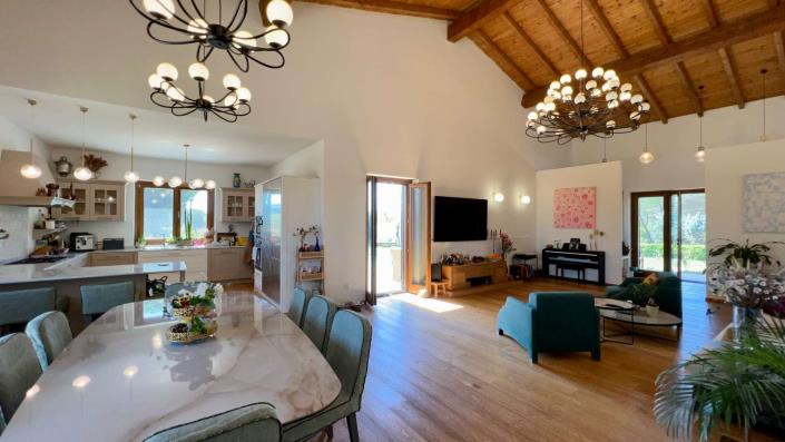 A large double living room with exposed beams and a spacious open kitchen. A library/study adds further space for relaxation and creativity.