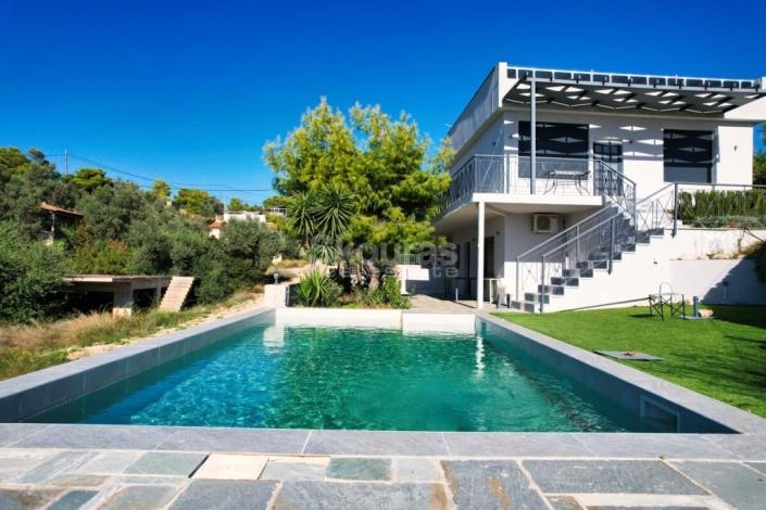 New! In one of the most privileged spots, with a unique, unobstructed view of the city and the port, a fully renovated 2-level detached house with a total surface of 107 square meters, within a fenced plot of 539.19m² is available for sale. This is a residence that was reconstructed in 2019. It is located in a separate spot among the green and its view is very unlikely to be restricted. The neighborhood is sparsely built and there is no urban planning possibility for further developement. The volume of the residence extends over two levels. The ground floor of the residence consists of a kitchen room, a bathroom and a bedroom. From this level, we have direct access to the landscaped garden and pool. The first floor consists of a single living room with a kitchen, a bathroom and two bedrooms (one of them a master with its own bathroom). The levels communicate with each other with an external staircase. The plot is fenced and beautifully landscaped. It can be accessed by a cement, rural road. As an example, we mention that the residence is located at a distance of 1.5 km (600 m in a straight line) from the center of Portoheli and the port, 5 km from the port of Costa that connects us with the picturesque island of Spetses, 6 km from Kranidi with the shops, banks and the health center and 200 km from the international airport of Athens. Skouras Real Estate Real Estate Agency in Portoheli Kranidiou Str, Portoheli, P.C. 21300 Members of EPPA, CEI, NAR