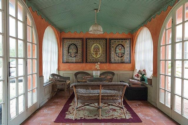Villa Bohème is arranged over two floors. At the entrance a fountain welcomes us and lets us enter the main door. On the ground floor there is a large entrance hall, a dining room with access to a beautiful veranda, a Provencal-style kitchen, a wonderful winter garden, a study, a sitting room, a large living room, an anteroom, a bathroom and a closet.