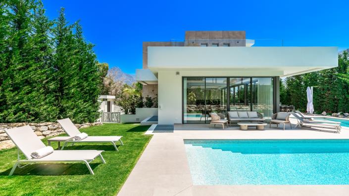 Luxurious 4-bedroom villa nestled in the heart of La Cerquilla, Nueva Andalucia. This splendid home, completed in 2023, spans three generous floors, covering a total area of 770 square meters on a spacious 1000 square meter plot. Meticulously crafted, every detail of this villa exudes a perfect blend of luxury and modernity. The southward orientation ensures mesmerizing views of the golf course, mountains, and a meticulously manicured garden, creating a picturesque setting. Inside, you'll find four spacious bedrooms and an equal number of bathrooms, offering a life of comfort and grandeur. The thoughtful distribution across three levels maximizes space, providing a seamless flow between areas. High-quality materials and specifications consistently run throughout the house, creating an inviting and elegant atmosphere. This residence comes fully equipped with a range of appliances to enhance your living experience. A combination of covered and uncovered terraces beckons you to enjoy tranquil moments, whether it's a morning coffee or an evening get-together. The private garden, a lush oasis, complements the villa’s facade and leads to a secluded swimming pool, promising countless moments of relaxation and fun. The villa goes beyond the ordinary with its added features. An engaging games room becomes the hub for entertainment, while the climate-controlled Bodega caters to the connoisseur’s taste. The property also impresses with an extensive driveway leading to a spacious garage. Convenience is a stone's throw away, with essential amenities such as shops, restaurants, schools, and the beach just a few minutes drive away. This property is not just a home; it's a lifestyle destination where comfort, luxury, and convenience come together seamlessly. Your dream residence awaits.