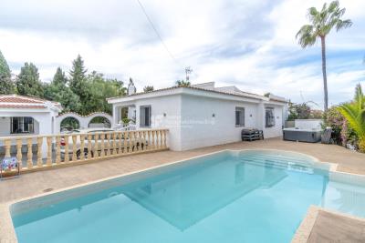 The villa with its 154 sqm has 3-4 bedrooms, 3 bathrooms, living room and kitchen. The kitchen, which is separated by a bar counter from the living room, is fully equipped and has a well thought-out work surface and good storage facilities. In the kitchen you have a nice light from the window above the sink. In the living room there is a separate dining area, TV furniture and lounge area. 2 of the bedrooms have built-in wardrobes and bedroom number 3 is currently used as an office.