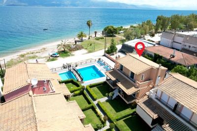 The main home is spread over the upper two levels with the main entrance on the elevated ground floor leading to a lounge with fireplace and dining area, with direct access to balconies, looking out over the pool to the beach and sea views. Adjacent is a large, well-designed kitchen. Upstairs are the three bedrooms, one of which is a master with its own ensuite bathroom, plus a family bathroom.A guest apartment with an independent entrance is found on the lower ground floor level. The bright one-bedroom apartment has and open-plan lounge-dining-kitchen area with a fireplace, a separate bedroom with built-in wardrobes and a bathroom.All three levels of the residence are connected by an elevator. There is also an external staircase giving access to the first floor balcony and bedrooms. The two storage rooms on the ground floor house the boiler for the heating system and the engine room for the elevator respectively.The home has a covered area with the built-in barbeque and has two exclusive parking spaces right outside the residence. The home has the most privileged position in the small complex, directly beside the large communal pool and with unimpeded views of the beach and Corinthian Gulf.The seaside settlement, also famous for the local thermal springs, is just 7km from Aigio and 35km from Patras. Around a two-hour drive from Athens/Airport, it is easily accessible any time of the year.
