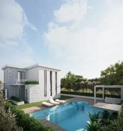 Small-scale project with 5 villas in Pefkochori, Kassandra. The villas of 120m2 have a private plot with a swimming pool of 800m2. The villas consist of a living room with kitchen and bathroom on the ground floor. On the first floor there are 3 bedrooms and a bathroom. The plot is located 2 km from the sea. The villas are delivered finished with tiles, bathrooms and kitchen. The buyer only needs to furnish the home with furniture.