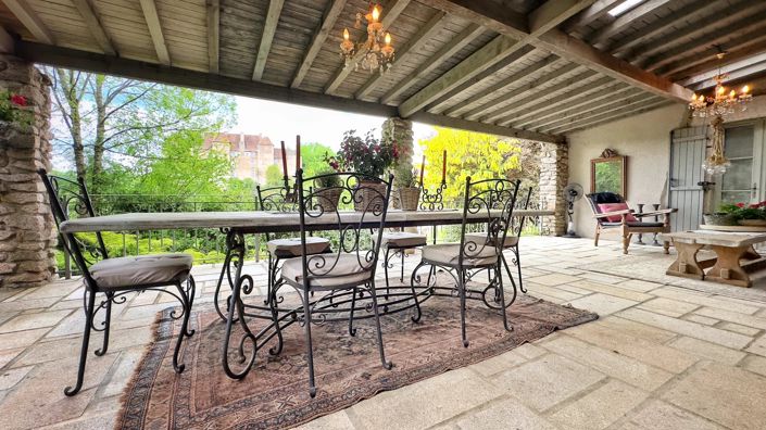 A large covered terrace extends towards a breathtaking view of the chateau and old town, providing an ideal space for entertaining and relaxation. A large storage area is located below.