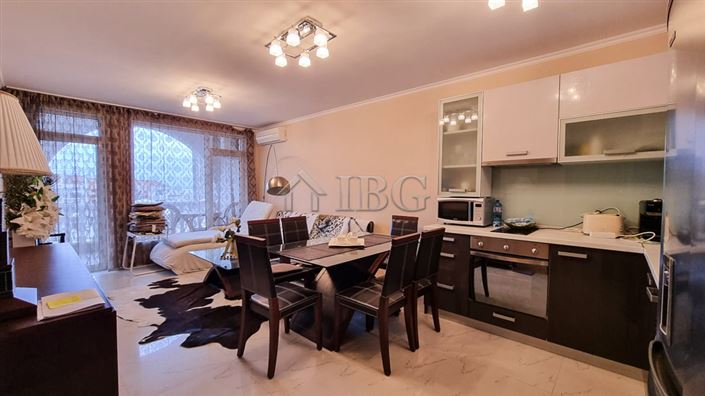 The apartment is 66 sq.m., located on the second floor and offering an entrance hall, a living room with kitchen and dining area, 1 bedroom, a balcony with view of the well-kept territory of the complex and a bathroom with shower cabin, toilet and sink. The apartment is in very good condition and for sale furnished and equipped.