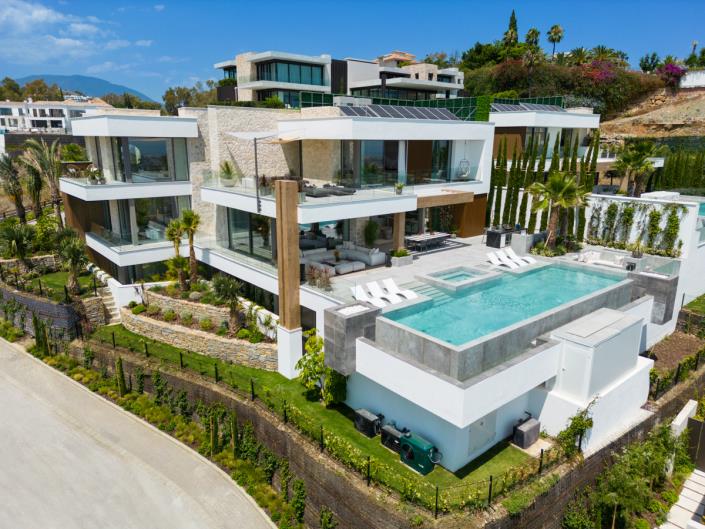 Nestled in the exclusive gated community meticulously designed, it offers breathtaking panoramic views from the Mediterranean to Africa. The contemporary masterpiece features vast open spaces seamlessly blending indoors with outdoors. A zero-edge pool, complemented by an outdoor cinema, creates a captivating visual spectacle. The outdoor kitchen and dining areas provide an ideal setting for gatherings in the Mediterranean climate. The villa boasts a sumptuous spa with an indoor pool, steam room, sauna, and massage rooms. A fully equipped indoor gym and entertainment room cater to fitness and leisure needs. Six exquisitely designed bedrooms showcase craftsmanship and elegance, with the master bedroom offering sweeping sea views. The custom walk-in closet leads to a luxurious bathroom With unparalleled design, breathtaking views, and exquisite amenities, it stands as a dream home for those seeking modern living in Marbella.