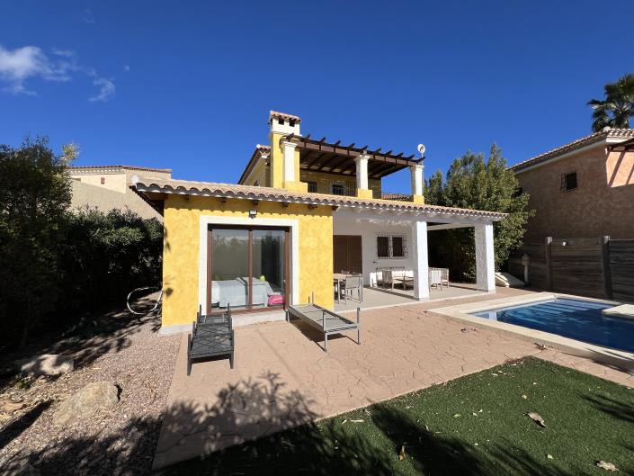 The property has been extended at the side and now offers very spacious accommodation with 4 bedrooms and 4 bathrooms as well as large living areas offering flexible dining and sitting areas. The gardens are private with useful storage sheds and its own private pool. There are exceptional golf views from the first floor terrace off the master bedroom. The community pool is just a few meters away. VIEWING RECOMMENDED.