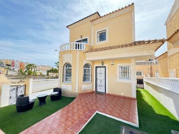 The property is just a short walk from local amenities and a 5 minutes drive from local commercial centres and Golf Courses. Situated on a small community of Villas the property has direct access to the communal pool. Benefiting from its corner plot the villa has a nice front terrace with seating area leading round to spacious side garden with artificial grass area. Inside it offers a lounge with recently refurbish kitchen, 2 bedrooms both sharing a family sized bathroom. Upstairs is a master bedroom with balcony, bathroom and large rear terrace.
