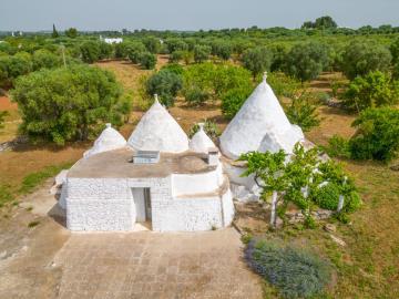 The covered property of approximately 70 m2 is located in a dominant position and is made up of two adjacent buildings: a three-cone trullo, with a large room with fireplace and comfortable alcoves, close to which an extension has been built. with lamie to create a bathroom and a kitchenette; a trullo with alcoves which houses another room and a bathroom.