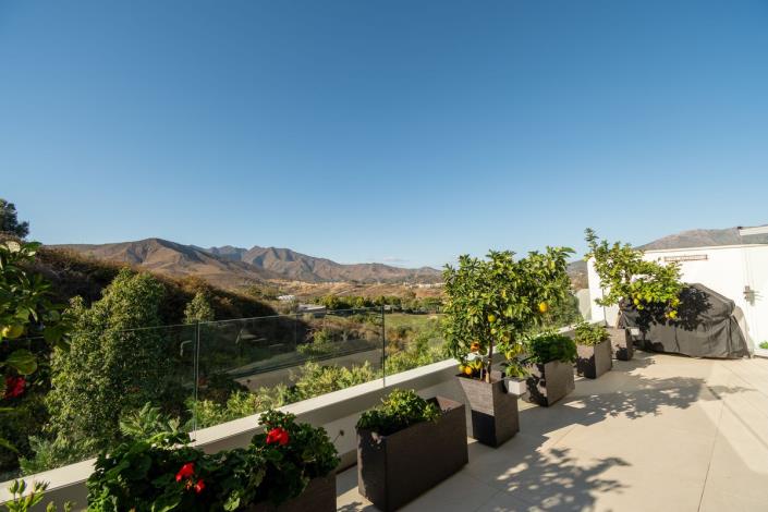 Stunning two bedroom elevated ground floor apartment located within the most exclusive gated community in La Cala Golf Resort. This exquisite two-bedroom ground-floor apartment offers an exceptional blend of luxury living and prime golf course surroundings, nestled a short walk from the Hotel, Spa and Clubhouse in La Cala Golf Resort. The property offers an ideal retreat for those who appreciate golf and leisure. It is also just a 10-minute drive from the beautiful beach front town of La Cala de Mijas, where you will find all general amenities including several major supermarkets, Health Centres, etc, etc. The apartment's interior is a masterpiece of design and functionality, with an open-plan kitchen boasting high-quality appliances and a custom-built island unit. The lounge is bathed in natural light with Schuler light fittings and leads to an expansive terrace of over 60 square meters, equipped with glass curtains - ideal for the winter months! From this terrace, you'll revel in breathtaking frontline golf and mountain views. The guest bedroom features a versatile pull-down bed, doubling up as an office space, and comes complete with a a fully fitted modular unit. Additional features include a family bathroom and a beautiful master bedroom with an en-suite bathroom and direct terrace access.