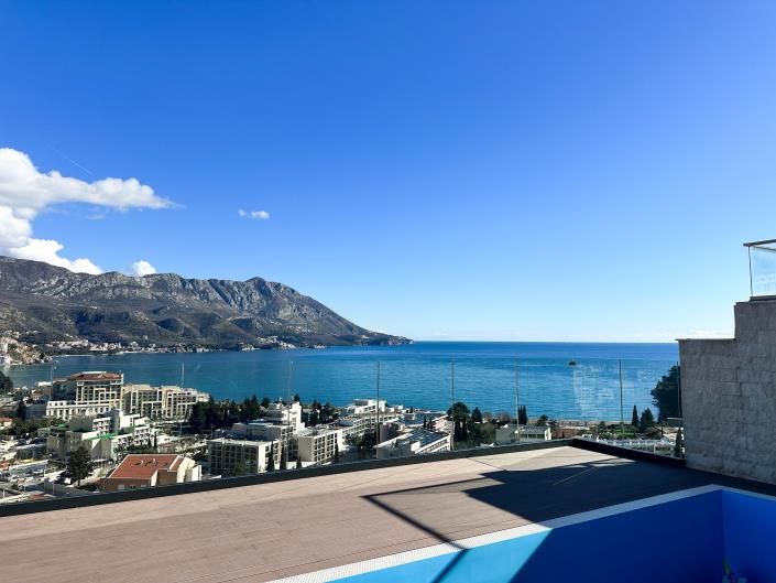 Presenting an expansive penthouse offering panoramic vistas of the enchanting Budva Riviera, situated in the idyllic coastal town of Becici.