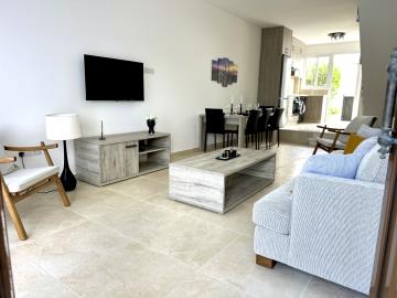 This townhouse is located in the developing area of “Tombs of the Kings”. With carefully designed features, such as marble staircases, Italian tiles, granite kitchen worktops, generously sized bedrooms, sea-facing balconies, bathtubs and open plan living room areas, our townhouse delivers an unmistakable sense of unique Mediterrenean living to even the most demanding of residents. This townhouse is ideal for a permanent residence, an investment, or a holiday home. It is a fully renovated, refitted luxurious two-level house, which is adjoined yet has independent access, 2 verandas and mature gardens from either side of it, contains 2 bedrooms, one of which has a Kings size bed and the other two twins, both having modern, leatherette beige headboards 2 bathrooms, A/Cs and wall-mounted TVs in all rooms.