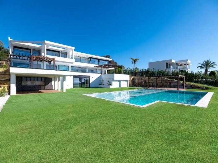 Newly constructed contemporary villa with sea views in Marbella Club Golf Resort, a gated community in Benahavis with 24 hour security, golf course, restaurant and equestrian center. This new residence has been constructed using high quality materials throughout and boasts an open-plan, bright distribution, double height ceilings and full-length feature windows. On the entrance level we find a good-sized living room with feature fireplace, backed by gorgeous book matched marble, all open plan and leading to the kitchen which features Gaggenau appliances. Both the living area and kitchen enjoy access to the terrace via pocket Schuco doors, from where you can enjoy breathtaking vistas of the Mediterranean Sea, as well as Gibraltar and the Morocco coastline on a clear day. On this level there is also a small swimming pool, separate to the main pool and garden.