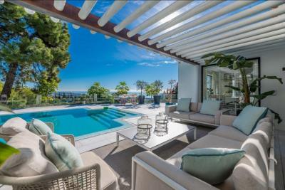 Stunning modern villa offers one of the best sea views of Marbella. Immersed in nature This exceptional south-facing, five-bedroom family home sits on the exclusive gated community Cascada de Camoján. Set on approximately 1.500 square meters of flat land. The home was recently been exquisitely refurbished. There is an incredible cupola that presides over the beautiful hole. This exceptional villa offers on the main level, four bedrooms en suite, multiple indoor and outdoor entertainment spaces a beautiful kitchen with sea views, a charming living room with a cosy chimney, and a nice dining room with stunning sea views to indulge your days in a peaceful atmosphere. Everything opens out onto the pool area and garden. Outside on the pool area, you can enjoy the chiringuito with a pool house, a shower, and a bath. Panoramic view infinity pool.On the second level, there is a beautiful guest apartment. Garage for two cars and 2 cars out on the car porch. Ideal for a family because is nestled in the prestigious neighborhood with total privacy and it´s a nice investment because that area is a prime location that effortlessly combines peace and quiet with easy access to the most prestigious international school, center of Marbella, beach, Marbella Club and Puente Romano, airport, shops centers.