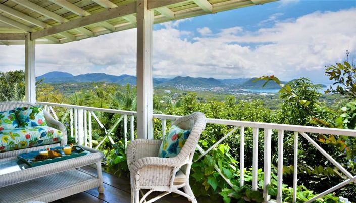 Doors from the dining room lead onto the terrace with views of Pigeon Island and Rodney Bay.