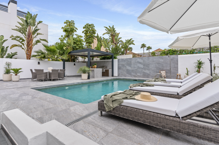 Stunning fully renovated modern design villa located walking distance to all general amenities, the beach and Puerto Banus Marina. The villa is split over two levels, briefly comprising, at entrance level, two en-suite double bedrooms, an open plan living room leading directly to the terrace. The garden has a private swimming pool, a fabulous outdoor kitchen and pergola. On the first floor you find the master bedroom with an en-suite bathroom and a large private terrace area. This villa is located in the heart of Nueva Andalucia, with easy access to the beach, Puerto Banus Marina and the town of San Pedro. It's a great investment property which can generate a very high rental income due to the superb location. Contact us now!