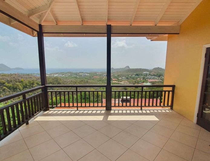 To the left is the kitchen with dishwasher, large fridge/freezer, gas cooker and burners, large microwave and a substantial breakfast bar. The adjacent dining area has seating for 10 and double doors onto a large balcony with fantastic views over Rodney Bay and Pigeon Island.
