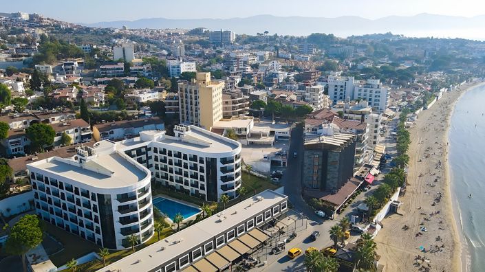 The flat for sale in Aydin, Kusadasi is located at the sea and beachfront, 50 m from the market, 3 km from the marina, 20 km from Ephesus Ancient City, and 65 km from Adnan Menderes Airport.