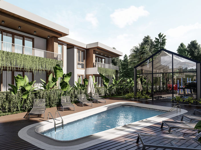 The flats in 2-storey buildings offering a detached living space are offered for sale in two different types 1-bedroom and 2-bedroom. Built in 2 stages, the project has a total of 72 flats. The flats have options of a garden and balcony. The horizontal architectural project includes facilities such as lush landscaping, a pool, a gym, a basketball court, a garden, a 24/7 camera system, and security.