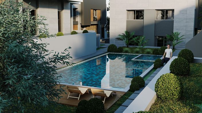 The stylish houses are situated in a project consisting of 9 houses on 2.569 sqm of total land. In the project, there is a landscaped garden, communal swimming pool, sunbathing areas, kids' playground, 24/7 security camera system, generator, and automatic irrigation system.