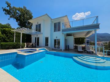 A couple of steps down takes you into the Lounge area with wall mounted TV, there are patio doors & windows to the whole front and another patio door to the side with amazing views out over Ovacik. These lead out onto the front covered terrace which has plenty space for dining and relaxing at the poolside.