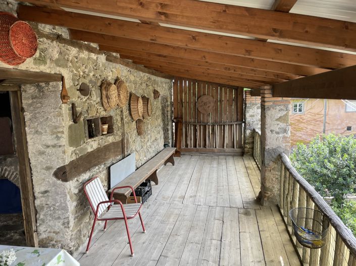 From the loft area we have direct access to a very pleasing covered balcony and a covered open terrace room, with exposed stone masonry and beams. In this space we find a wood-burning oven and wood store.