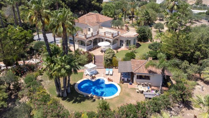 Stunning Villa in Alhaurin el Grande,set within a sprawling 9539m² estate, perfect for those seeking a tranquil rural lifestyle. This exquisite property is adorned with over 65 mature olive trees that yield more than 240 litres of premium olive oil bi-annually, along with a variety of fruit trees and fresh produce that promise a bountiful harvest throughout the year. Embracing sustainable living, the villa is equipped with photovoltaic solar panels, making it not only energy-efficient but also a model of environmental responsibility. A dedicated well ensures a constant water supply for the estate, keeping the lush gardens and olive trees in pristine condition. Beautiful paved walkways, charming bridges, a serene carp pond, and numerous seating areas where you can relax and soak up the Mediterranean climate. The garden boasts a rich variety of flora, from majestic palms and conifers to resilient cacti and vibrant Bougainvillaea, creating a picturesque and tranquil environment. Inside, the villa offers a spacious and thoughtfully designed interior. The main level features a grand entrance hall that leads to the master bedroom, complete with a full ensuite bathroom, ensuring privacy and comfort. The open-plan lounge provides access to a terrace, perfect for indoor-outdoor living. A traditional fully fitted kitchen, ideal for culinary enthusiasts, is complemented by a sunroom and a glass-enclosed dining room, providing versatile spaces for relaxation and entertaining. The second level houses two additional bedrooms, each with ensuite bathrooms and private terraces that offer breathtaking panoramic views of the mountains and countryside. The highlight of this villa is undoubtedly the pool area, located on the lower terrace. This outdoor oasis features a heated swimming pool, a dining area, and a fully fitted kitchen, perfect for al fresco dining with stunning mountain views, ensuring year-round enjoyment. Further enhancing this property is a separate guest house with ensuite bathrooms, providing privacy and comfort for visitors. There is undercover parking for two cars and a driveway that can accommodate at least four more vehicles. Utility spaces include a utility room and workshops for various needs, and a full irrigation system keeps the garden lush and vibrant. For added security and comfort, the villa is equipped with an alarm system and a wood-burning stove to ensure warmth during the winter months.