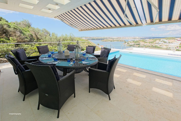 This stunning west facing villa is located in the exclusive Cala Llonga urbanisation in the picturesque port of Mahón, Menorca. This beautiful home is contemporary in style and built over 3 floors all with lift access, and boasts the most incredible panoramic views of the town and harbour. Being one of the largest modern constructions available with such breath taking sea views, this villa offers it all. Custom-built in 2014 for the current owners, there are 4 large double bedrooms, all with their own ensuite bathrooms, plus 2 further bathrooms, lift, private garage for 2-3 cars, off road parking on street level for a further 2 cars, solar panels, heated pool, A/C hot and cold, stunning panoramic views plus an additional area in the basement that can be turned into a cinema room/gym/spa/indoor pool/entertainment area should the new owners wish to.