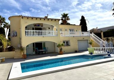 Beautiful four bedroom villa in Benissa/Calpe. Situated in a quiet residential area within walking distance to the beach based on two levels with a ground floor self-contained apartment which can be used for guest or rental purposes the first floor contains three double bedrooms two bathrooms large lounge with double doors onto a spacious terrace overlooking a beautiful swimming pool. It also has an integral round dining room. The kitchen is very modern and well fitted. The. Villa has air-conditioning, central heating and a gas and oil boiler. there is plenty of storage with seven double wardrobes two single wardrobes and floor to ceiling shelving there is also a garage and large storage and utility area. There is a cloakroom. The property is on a corner plot and is surrounded by beautiful plants and trees also various seating areas including an entertainment area with a cabana and swing seat the pool surround is extensive and has plenty of room for sun beds table and chairs and also has PowerPoints as well there are five taps and three irrigation systems